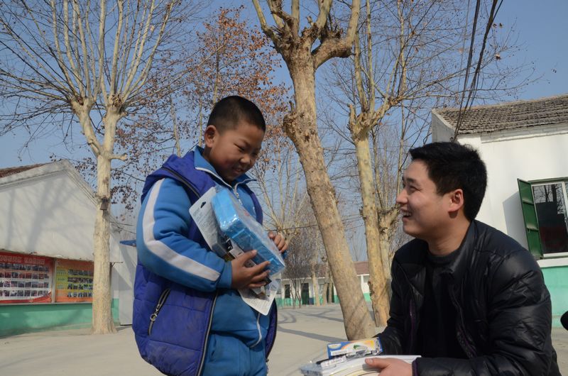 “你看,這是文具,還有籃球、足球一些運動玩具,都是送給你的……”看到叔叔阿姨們送來的新書包、新學習用品,小允杰很高興。